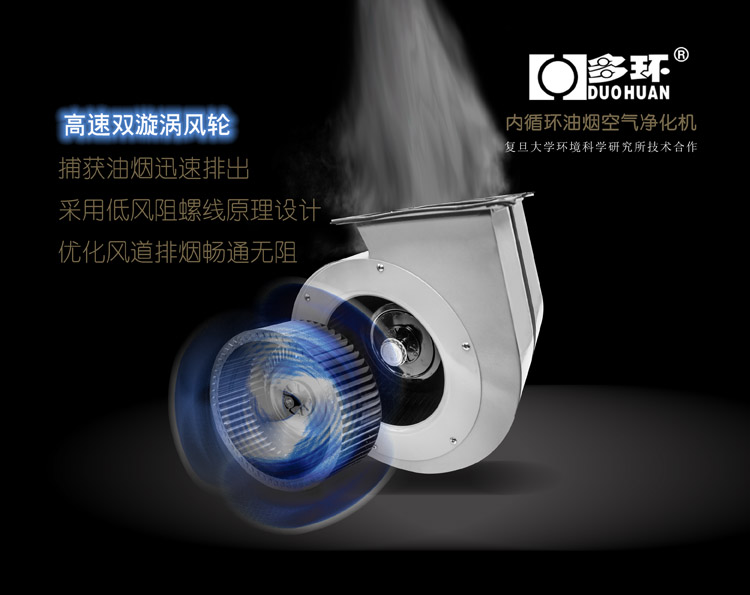 二、将本公司**的单电机双风道离心风机应用于该净化机,使得该循环式油烟净化机与传统的单风道风机相比在同等进排气量下(≥21立方/分钟)省电30%,噪音减少30%(≤52分贝),同时**的风机设计将**次烟气尚未完全净化的微量油脂经离心风机第二次离心净化,使油烟气体的油脂得到了全部分离净化。