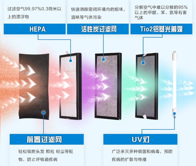 四、紫外线消毒杀菌。该机装有紫光灯管,可通过紫外线**烟雾,消毒杀菌,同时通过紫光灯与光触媒纳米材料的组合,将烟雾处理器的净化功能增强**。