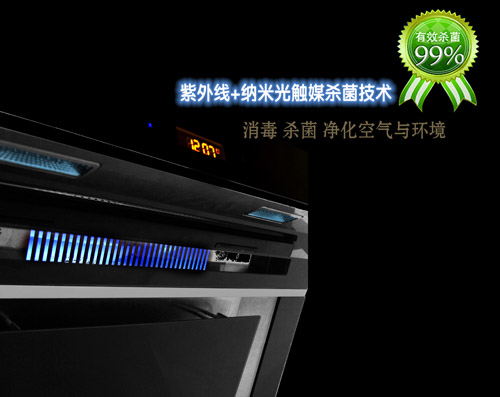 六、室内空气净化功能。该机设置有活性炭、光触媒纳米等高科技材料的烟雾处理器,在不做饭时打开净化机,能有效去除房间内的污染物PM2.5、甲醛、烟味、粉尘、厕所异味等,且内循环风量大,空气净化快,比普通的空气净化机效果优异,实现了一机两用的效果。