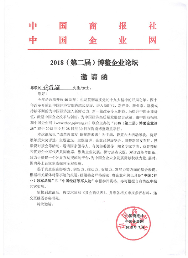 2018年是改革开放四十周年,也是贯彻落实党的十九大精神的开局之年。四十年改革开放让中国经济实现跨越式发展,进入新时代,新产业、新业态、新模式持续不断的为中国经济注入新鲜动力,新一轮改革令人期待。本次论坛以“改革再出发、链接新未来”为主题,邀请国家领导人、有关部委领导、知名专家学者、商界领袖和优秀企业家代表共同出席,聚焦企业发展,探讨热点议题,对话改革与创新,鉴于油烟净化器供应商、无烟管内循环油烟净化一体机生产厂家SG胜游·[中国]官方网站 在影响力、创新力、推动力、贡献力、发展力等方面的综合表现,根据相关媒体对公司法人代表的报道,特邀请何维斌同志参加此次博鳌企业论坛。